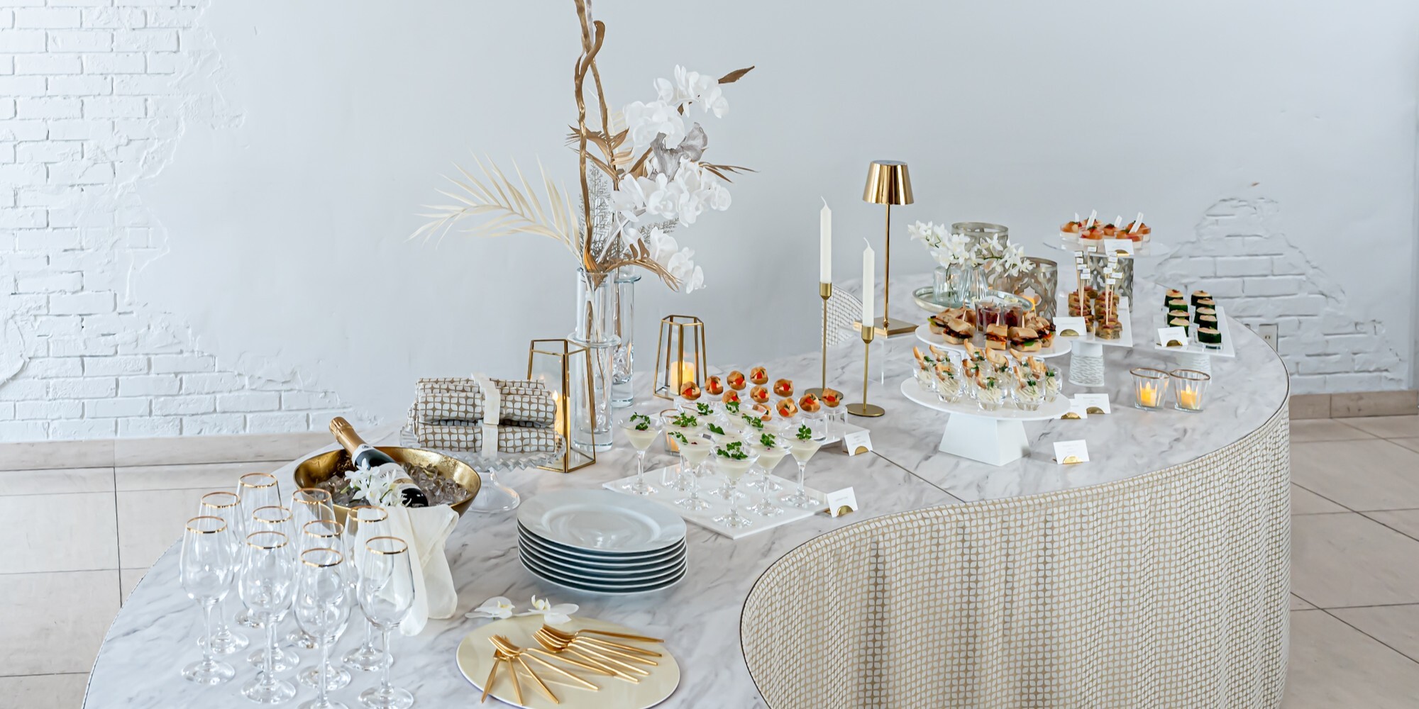 さらに、白い大理石調の天板に合わせて、ゴールド×ホワイトの柄が印象的なテーブルスカートをセレクト。カトラリーなどの小物もゴールド系で統一することで、空間全体に洗練された統一感を持たせました。フードを乗せるプレートには白のアクリル板を使用し、料理の色彩を美しく引き立てています。